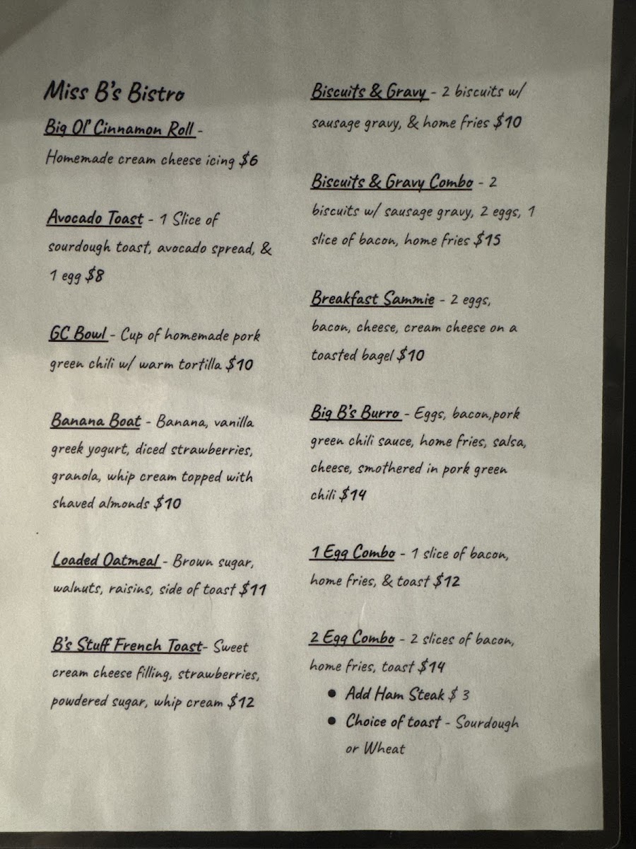 Miss B’s Bistro Menu